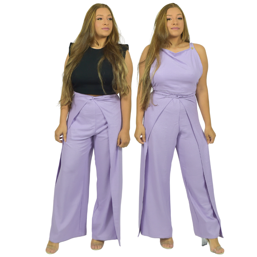 Calça Macacão transformável que pode ser usada de diferentes formas em diversas ocasiões. Ao adquirir nossa peça, você receberá um QR Code com vídeo explicativo ensinando como transformá-la.